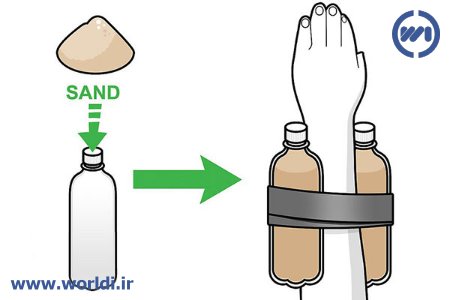 دو بطری را با شن پرکرده و مانند تصویر زیر آنها را با کش بر روی دستان خود محکم کنید. این کار باعث شده تا بطری ها دقیقاً مانند وزنه های بازویی در باشگاه عمل کنند. دقت کنید که کش نباید با دست تماس یابد. فقط باید با بطری ها در تماس بوده و آن ها را محکم نگه دارد. برای بالا بردن وزن آن ها نیز می توانید بعد از پر کردن بطری با شن، داخل آنها آب بریزید.
