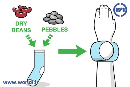 یک جوراب تمیز با اندازه ای مناسب که بتوان به راحتی به دور مچ دست بست را برداشته و با لوبیا پر کنید. یا برای سنگین تر شدن، از سنگ ریزه هایی مثل سنگ های ساحل استفاده کنید. جوراب را وزن کرده و زمانی که به وزن دلخواهتان رسید اضافه ی آن را قیچی کنید. دهانه ی باز جوراب را چسب زده یا بدوزید. سپس سر و ته جوراب را به هم متصل کرده و یا با نوار چسب محکم کنید یا بدوزید. اکنون مانند وزنه های مچی می توانید از آن ها استفاده کنید.