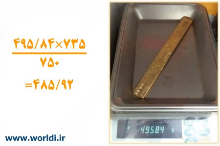 آبشده ی روبرو، عیارش 735 است یعنی پانزده خط پایینتر از 750، وزن آبشده هم 495.84 گرم است پس تبدیل وزن بدین صورت میشود:
