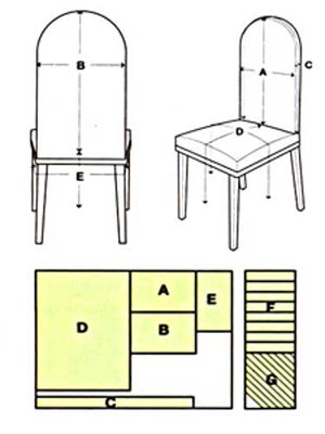 در تصویر، نحوه ی چیدن قسمت های مختلف الگو بر روی پارچه را مشاهده می کنید. عرض پارچه ی نقش دار ۱۴۰ سانتی متر و طول آن در حدود یک متر و ده سانتی متر است. ۵۰ سانتی متر پارچه ی جداگانه با رنگ متضاد برای بخش های F و G لازم است. این مقدار پارچه برای روکش یک صندلی با پهنای تقریبی ۵۰ سانتی متر و ارتفاع ۹۰ سانتی متر، کافی و متناسب است.