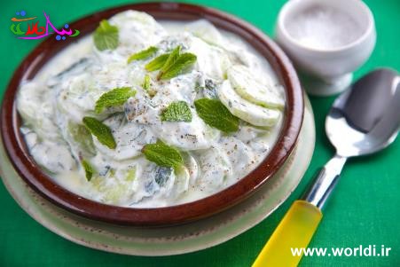 اول، خیار را به طور کامل شسته و تکه تکه کرده و نوار های نازکی از آن را برش دهید در کاسه بریزید سپس ماست، سرکه و سیر چرخ شده، نمک ریخته خوب مخلوط کنیم