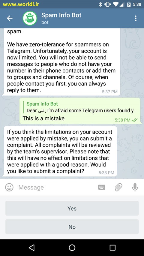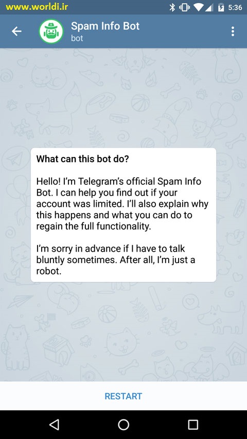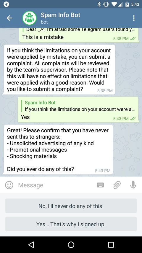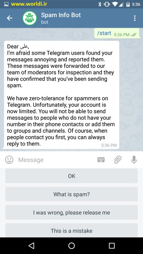 دنیای اطلاعات: تلگرام در تازه ترین بروزرسانی خود ربات spambot@ (اسپم بوت) را برای رفع مشکل ریپورت اسپم کاربران راه اندازی کرده است و شما دیگر نیازی نیست برای حل مشکل خود به تلگرام ایمیل خارج شدن از حالت ریپورت اسپم ارسال کنید.