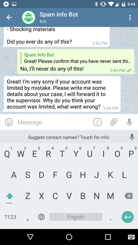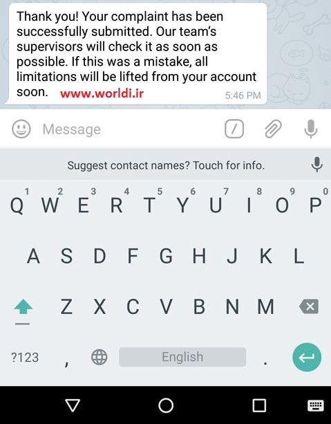 در پایان متن کوتاه زیر به زبان انگلیسی را برای مدیران تلگرام ارسال کنید.