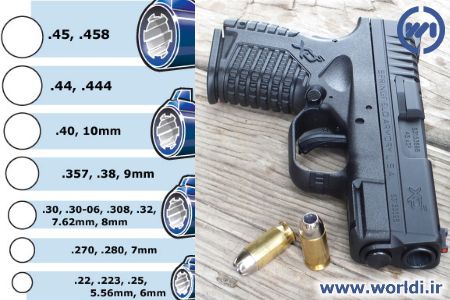 | .۴۵ | ۱۱٫۴۳ میلیمتر | ۰٫۴۵۱–۰٫۴۵۴ اینچ | .۴۵ ACP, .45 GAP, .454 Casull, .45 Long Colt .455 Webley | Bullet diameter depends on bullet type/material. Generally 0.451 in for full metal jacket bullets and 0.454 in for lead bullets. |