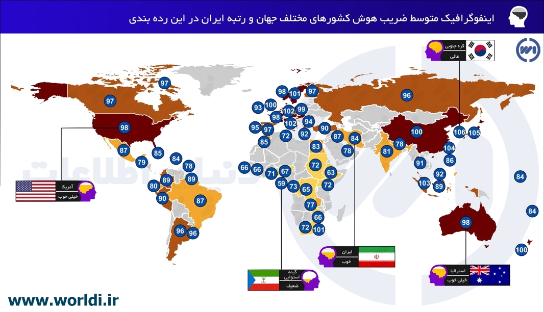دنیای اطلاعات: فهرست کشورها بر پایه ضریب هوشی نشان دهنده میانگین ضریب هوشی هر کشور و جایگاه آن کشور در جهان است. بر پایه این فهرست باهوشترین مردم دنیا به شرق آسیا و کم هوش تربن مردم نیز به جنوب آفریقا تعلق دارند.